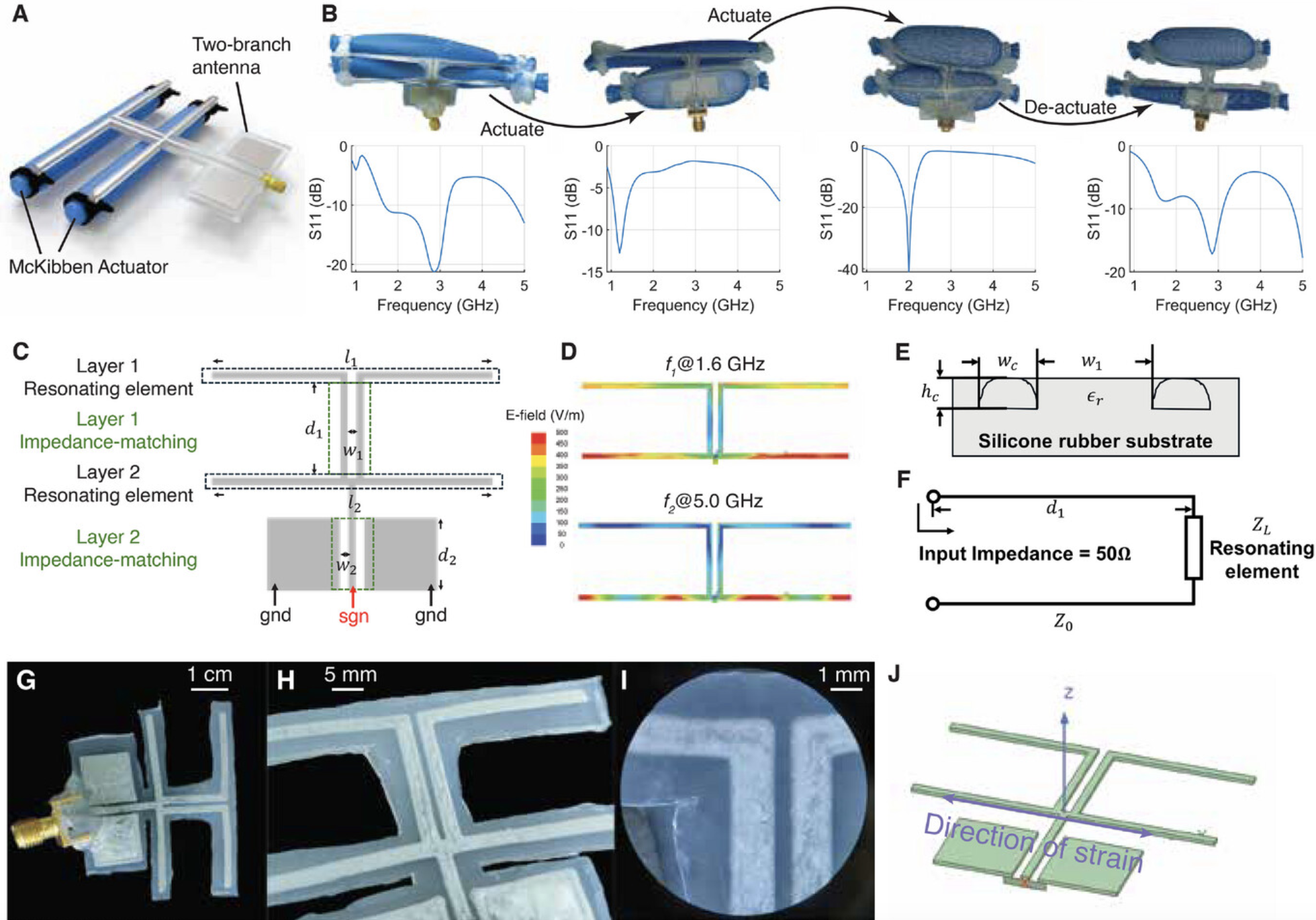 Software-defined radios and cognitive radios can switch their operating frequency across a wide range. Although analog and digital circuits enable cross-frequency operation of much of the RF frontend, there is a lack of practical antennas that are frequency-reconfigurable over such a wide range. Prior rigid antennas are either narrow-band with high radiation efficiency, or wide-band with low radiation efficiency. This study presents a soft, stretchable, compact, omnidirectional liquid metal composite antenna system to enable high radiation efficiency when reconfiguring to different frequencies across a wide band. On the hardware front, an extendable multi-branch stretchable liquid metal based antenna geometry is optimized that preserves high efficiency when switching across a wide range of frequencies. On the software front, a control algorithm is incorporated that ensures that the antenna automatically configures to the optimal received signal strength. The antenna design enables a strain limit of 33% for two independent actuatable branches, further enabling a switchable operating frequency range across 1–5 GHz. Experimental characterization demonstrates that PASTA reduces the radiation loss by 10–20 dB over the operating frequency range compared to state-of-the-art rigid and flexible antennas.