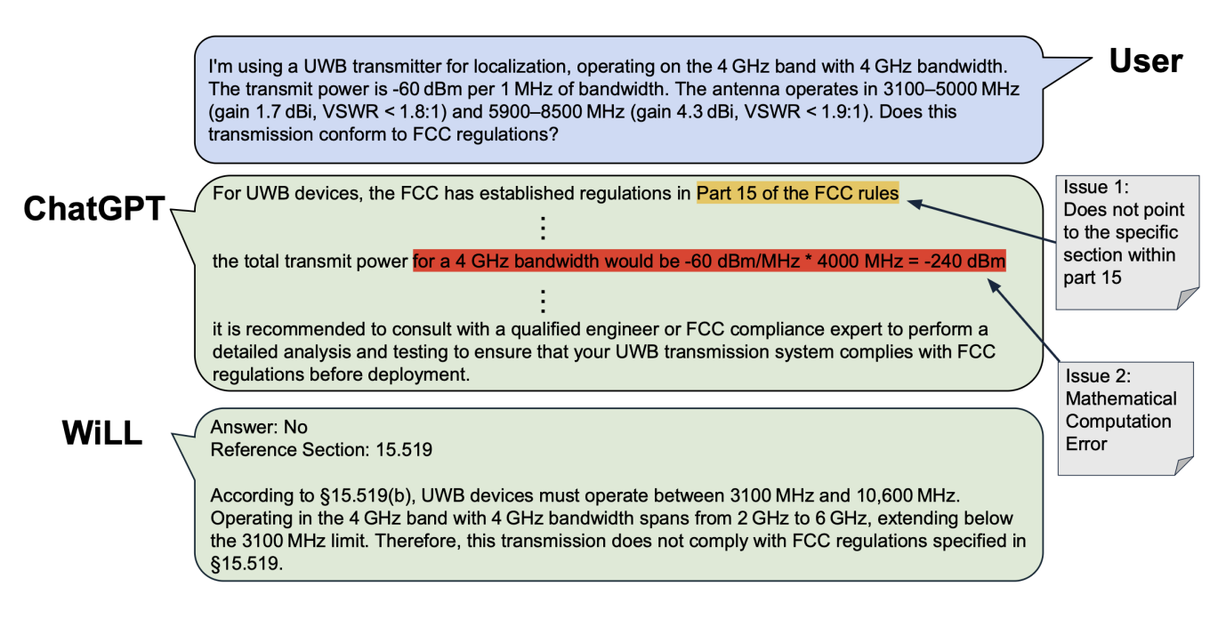 This paper asks if Large Language Models (LLMs) can provide wireless expertise, particularly in the context of spectrum regulations. For any wireless system designer, an effective choice of wireless parameters such as operating band of frequencies and total radiated power are one of the first considerations in designing any wireless system. The current approach to do this relies on human FCC experts, who consult large volumes of techno-legal documentation on government regulations (e.g. FCC rulebooks), standards, etc. To ensure the exhaustive coverage of various use cases of wireless systems, these documentation tend to be quite long and very hard to parse through, even for an FCC expert. Given the success of LLMs in providing expert and accurate responses to varied other domains, it is quite natural to ask if they can also help in assisting wireless system designers in ensuring their compliance to these techno-legal rules and regulations. In this paper, we present WiLL, a system developed on the backbone of a state-of-the-art LLM, that acts as an assistive tool for wireless system designers to ensure their wireless system complies with regulations. Specifically, we focus on ensuring compliance with FCC regulations for various wireless systems that are designed for technologies such as WiFi, Bluetooth, LoRaWAN and Ultra Wide Band (UWB). We observe that WiLL achieves an accuracy of 78.57%, as compared to an average 51.77% accuracy of the state-of-the-art Large Language Models.
